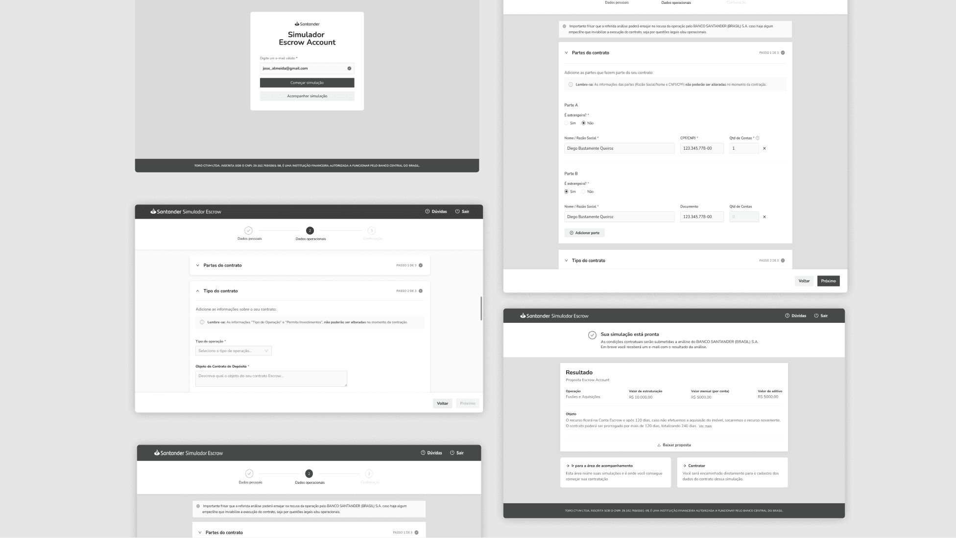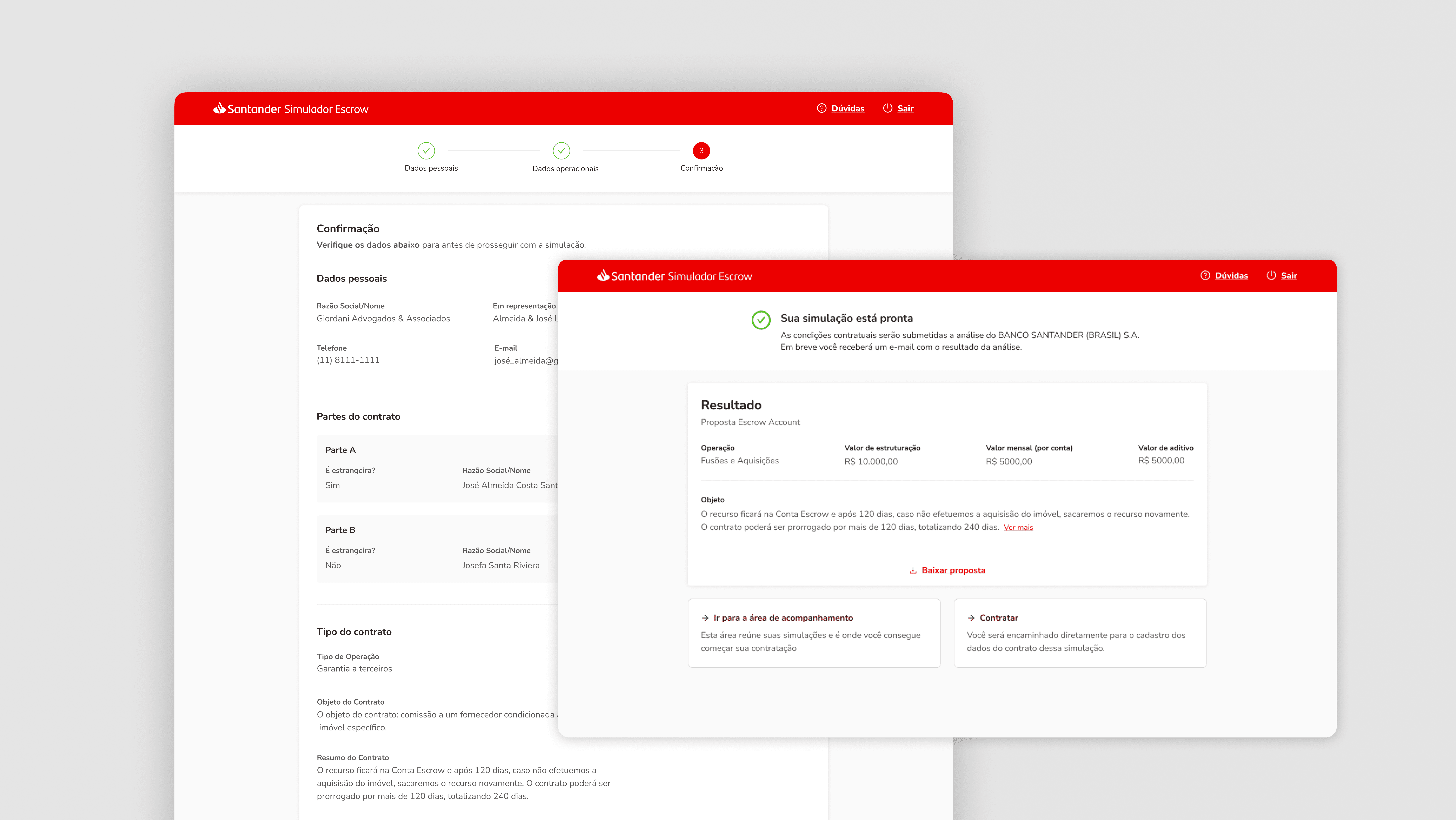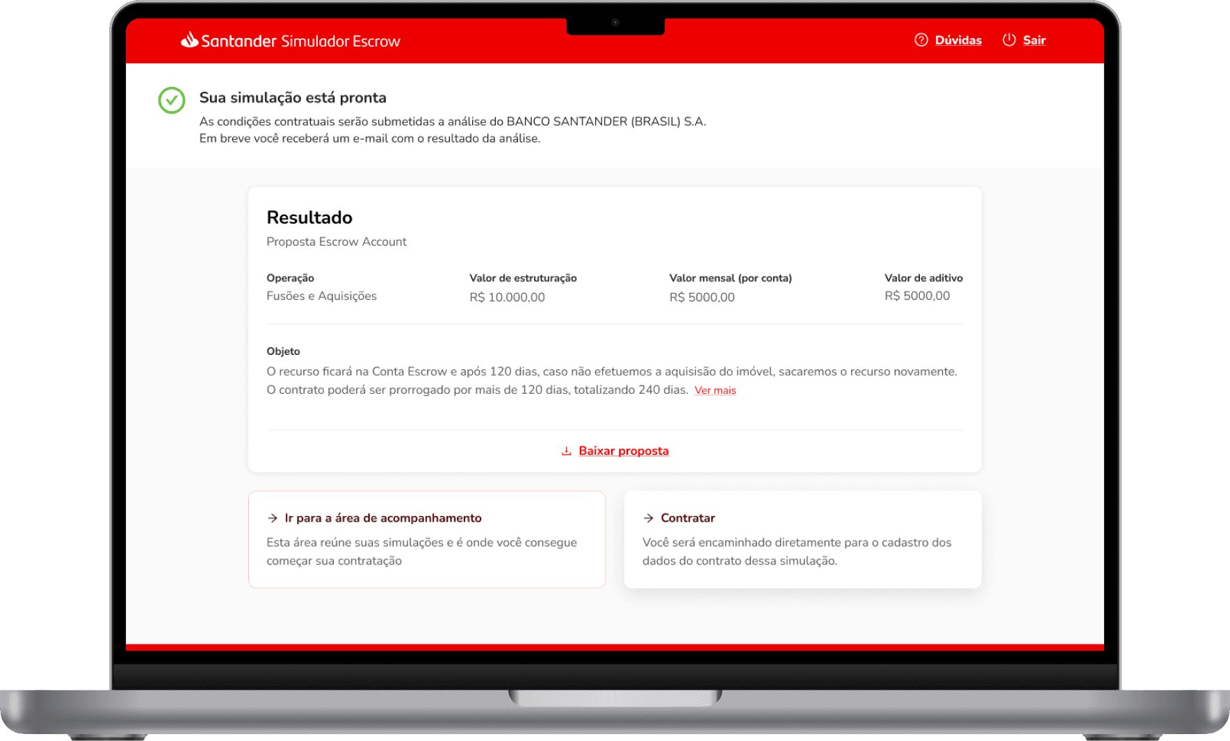 The Escrow Account web platform, designed for Santander S.A.'s multinational operations in Brazil, simplifies contract management and negotiations for businesses. Leveraging Santander S.A.'s global financial expertise, this platform empowers users to invest, manage, and monitor their contracts efficiently.